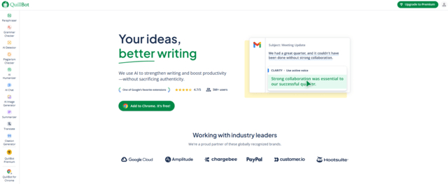 QuillBot is best known for paraphrasing and editing, but its suite (grammar, summarizer, citation tools) makes it a strong companion for essay refinement. It’s ideal when you already have a draft and need cleaner phrasing, tighter logic, and proper citations.